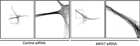 In Neuronen ohne MKK7 (rechts) tritt ein Bündelungsdefekt bei den Mikrotubuli ein. (Foto: Olivier Pertz)